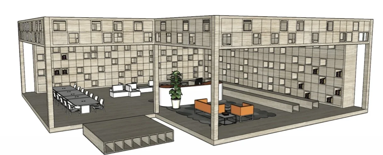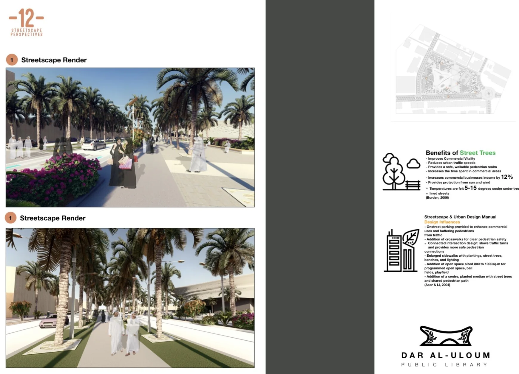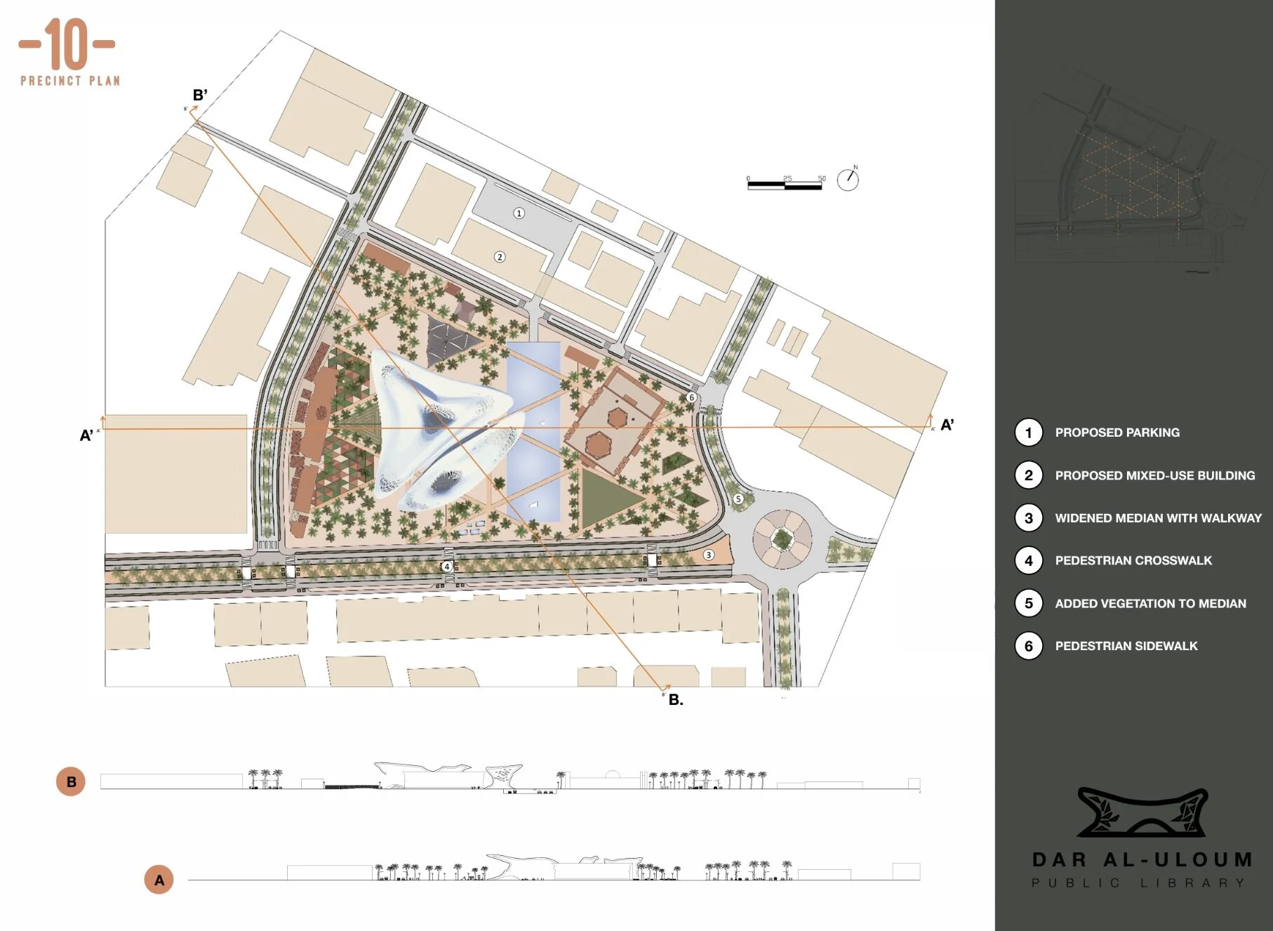 Overview: The Dar Al-Aloum Library Project was an interdisciplinary project completed by Environmental Design and Planning students and Interior Design students. The project site is the Abdulrahman Al Sudairy Cultural Centre in Sakaka, Saudi Arabia. Students were divided into groups and were tasked with the redevelopment of the existing Dar Al-Uloum Public Library and surrounding campus. The goal of the project was to reinvigorate a neglected culture center and create a meaninful place in the community that promotes education and engagement. Our group’s design focused on the themes of tranquility, connectedness, and opportunity. The design seeks to create a space that focuses on reconciling the transition of built forms, culture, power, and nature.