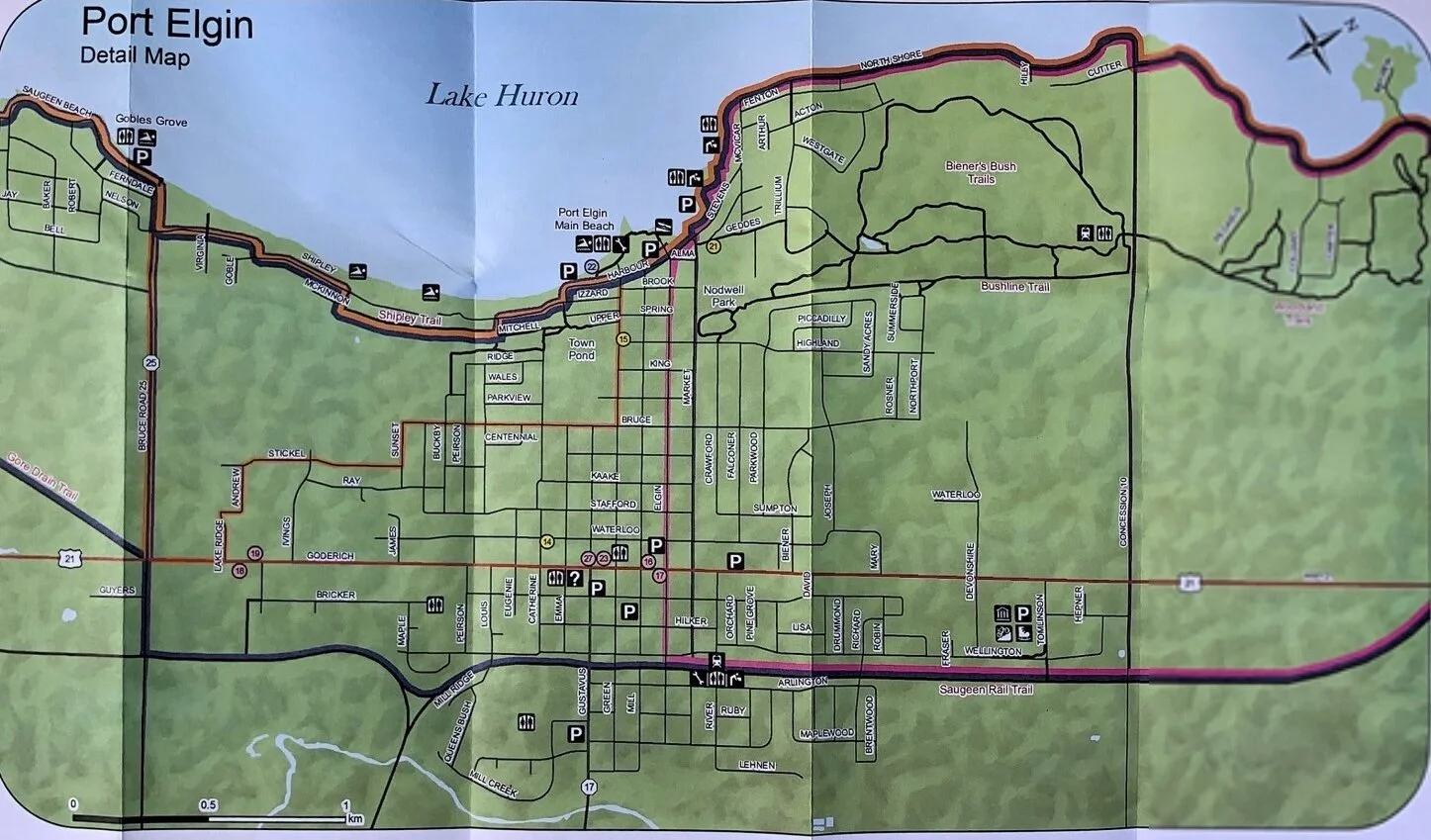 This map is available online for residents and visitors to explore Saugeen Shores walking and biking trails. Saugeen Shores include Port Elgin and South Hampton, this app allows users to zoom in and out between the two. Users are also able to overlay layers on the map. This helps with the apps legibility because users can display just the layers they want to explore.